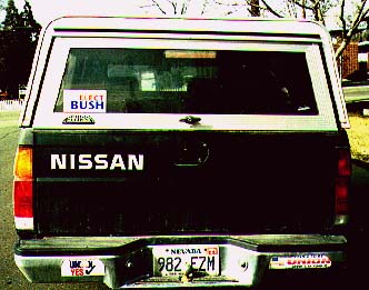 DIVIDE AND CONQUER a lesson in broken solidarity for both General Motors and United Auto Workers Union Local 2142, members of which currently staff GM's Sparks, Nev., parts distribution center. This mini-pickup was recently photographed on a Carson City street. We will mercifully not identify the two unions which issued the bumper stickers. If the vehicle's owner indeed voted for Dubya, he or she should know that among Bush the Lesser's first official acts was a presidential executive order aimed at destroying unions. (The AFL-CIO sued and a federal court just found it unconstitutional. The Bush administration has vowed to appeal the decision.)