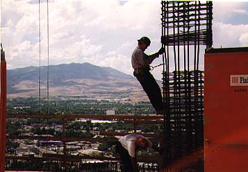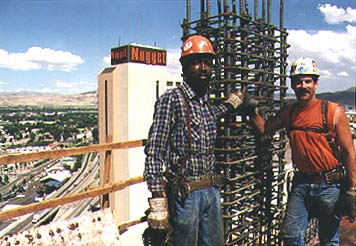 THE NEVADALABOR.COM SIGNATURE — Regular visitors to NevadaLabor.com will recognize this as the ubitquitous link for returning to the home page. Above is union ironworker Nick White at the top of the John Ascuaga's Nugget second tower construction, Sparks, Nevada, July 29, 1996.