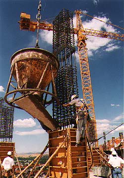 WHILE WE WERE TALKING, DON WAS WORKING — While Skip Daly and I were talking construction, Don wandered off and got some great shots, including this action scene of a high crane bringing a load of concrete down like a mother bird feeding her young. John Ascuaga's Nugget second tower construction, Sparks, Nevada, July 29, 1996.