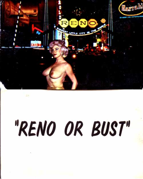 HISTORICAL NOTE — Yes, there's a history behind the three words printed on the flip side of the card. Back in Reno's glory days, gambling hall pioneer Harold Smith, Sr., had billboards placed worldwide reading "Harolds Club or Bust," a takeoff on the famed 19th Century "Pike's Peak or Bust" westward migration. So the bust in question had twin meanings. Pardon the pun.
