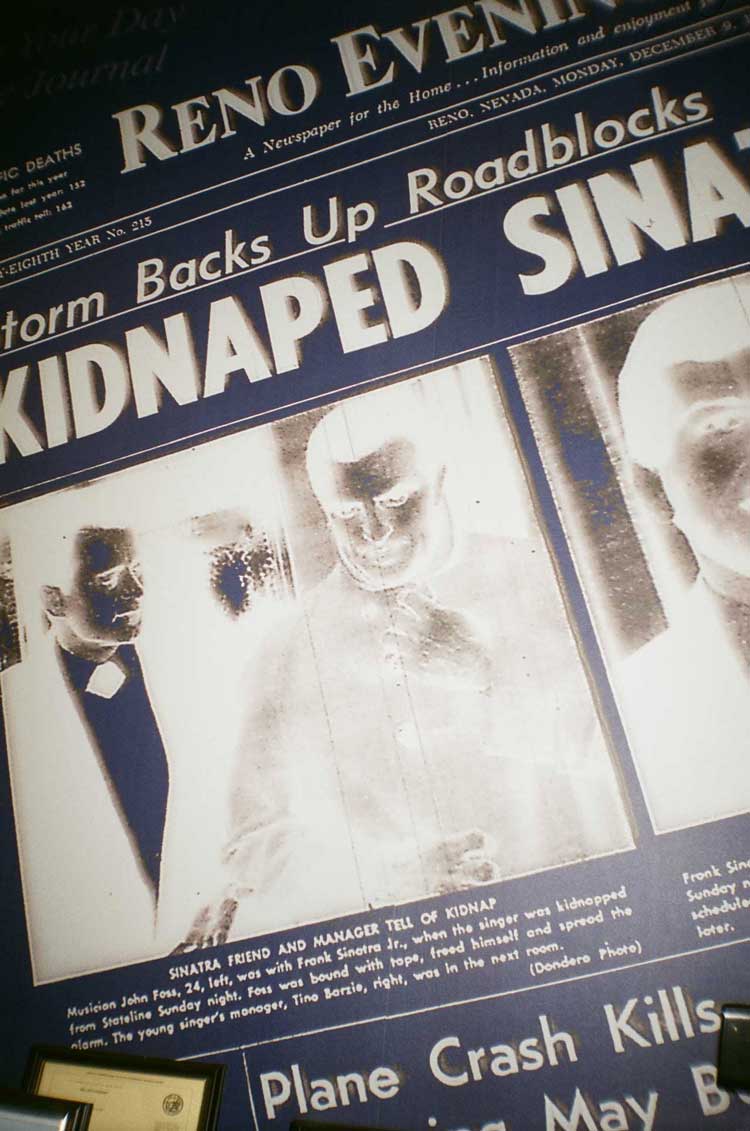 ENDANGERED SPECIES — The above detail from the 9 Dec. 1963 Reno Evening Gazette dominates the 12-foot-high wallpaper in the Kuenzli Street foyer of the Reno Gazette-Journal. The plaques at lower left are square with the floor. Part of the entry to the newsroom may be seen at lower right. For many years, Dondero's world renowned photo Frank Sinatra and Marilyn Monroe also graced the large RGJ reception/subscription area. With the paper now being printed at the Nevada Appeal in Carson City, the building will soon be sold and the historic wall thus becomes another endangered historical artifact. (Anachronism credits: Barbwire photo taken in July 2017; 35mm film [remember that?] processing by Gordon's Photo.)