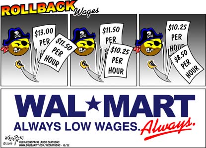 Nationally, Wal-Mart's unionized competitors have been hit with strikes and demonstrations, mostly over health care benefits. Employers say that in order to compete against Wal-Marts low-wage, largely part-time labor force, their own workers must take a hit. Union workers respond that the companies are enormously profitable and merely use Wal-Mart as an excuse to grind their own people.