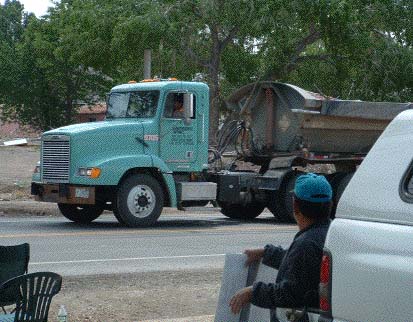 RAT PATROL A striking Teamster, above, watches an egg-sucking rat from Montana haul Reno rail trench dirt to the Lockwood Landfill. The Reno Gazette-Journal on Friday rubbed salt into sanitation worker wounds. Veteran reporter Susan Voyles wrote that your tax dollars which will be paying for Reno's $260 million+ gift to Union Pacific (better known as the downtown railroad trench) until ex-President Jenna Bush is well along on writing the memoirs of her eight years in the Oval Office your money is being spent to hire non-union drivers from Trans-Systems of Billings, MT, to haul contaminated dirt from the trench to the Lockwood Landfill. Read it and weep Better yet, get ahold of Reno City Hall.