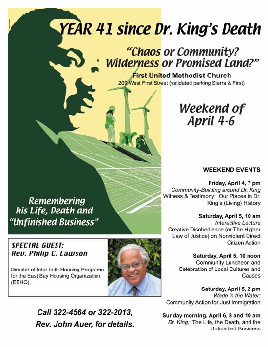 GET INVOLVED. Anyone who wants to volunteer for the Reuther-Chávez-King events may attend one or both of two meetings tomorrow. The first is at 10:00 a.m. at the First United Methodist Church at First and West streets in downtown Reno. The estimable Rev. John Auer is planning an entire weekend (April 4-6) of activity commemorating Dr. King.