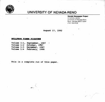 Bullfrog Times-Picayune Volume One, Issue One Yellow Journalism Returns to Nevada (September 1987). (Editor's note: Issue One includes an error. Travus notes the election which reconciled Nevada's north-south boundaries more than a century late. That referendum actually took place in 1982 with the passage of Question 5. Your humble editor opposed its approval as the last and best chance to blow Las Vegas the hell out of the Union. AB)