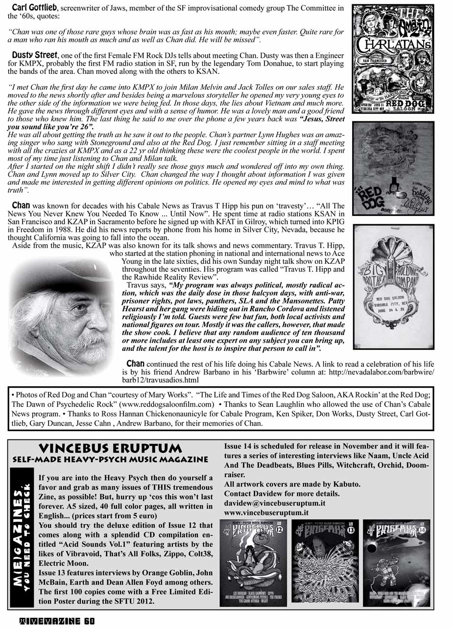 TimeMazine — issue 7 — is finally out.  It is mainly a magazine about psychedelic music from the 60s and also now.  I have an article on Chan — it is more  about him and music — and his involvement in the Red Dog Saloon and also how he was remembered. On the cover, you can see where it says down towards the bottom on the right "Travus T. Hipp."