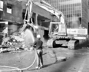 City of Reno contract demolition crews go back to work immediately after Judge James Hardesty lifted his injunction stopping demolition of Reno's historic Mapes Hotel. The Nevada Supreme Court later stopped work pending a review. The hotel remains scheduled for implosion on Super Bowl Sunday Y2K. Further clouding matters, the city still owes about $1.5 million on its purchase of the Mapes from former owner George Karadanis, operator of the Sundowner Hotel-Casino. The outstanding debt was not revealed by the city until a Reno Gazette-Journal story the day after the council voted to demolish the hotel. Councilman David Rigdon said he would not have supported demolition had he been informed of outstanding balance. The Mapes has been closed since just before Christmas, 1982. (Photo: Debra Reid, the Daily Sparks [Nev.] Tribune)