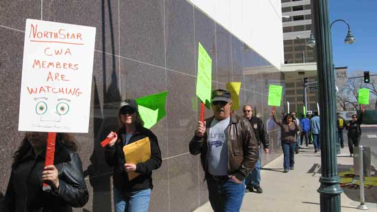 ON THE LINE CWA Local 9413 Vice-President Liz Sorenson (right rear, left of the lamp post), joins fellow members and representatives of other unions picketing Northstar's downtown Reno jobsite. United Auto Workers Local 2142 President Rudy Viola (in black AFL-CIO jacket with yellow sign), pickets just in front of of Liz.