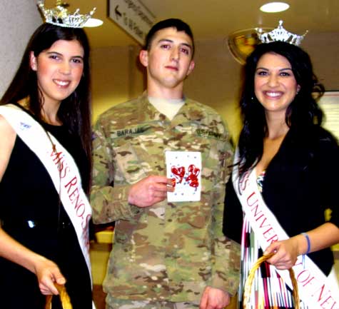 VALENTINE SURPRISE (10 Feb. 2012) Specialist David Barajas, Jr., home on two weeks' leave, wanted to surprise his mother and ended up with quite a surprise himself. David not only got a Valentine, he also got an up-close-and-personal photo with Miss Reno/Sparks Madeline Burak, left, and Miss University of Nevada Ashton Sunsiri, right. David is a 2008 graduate of Reno High School and a member of the Nevada Army National Guard's 485th Military Police Company stationed in Afghanistan.