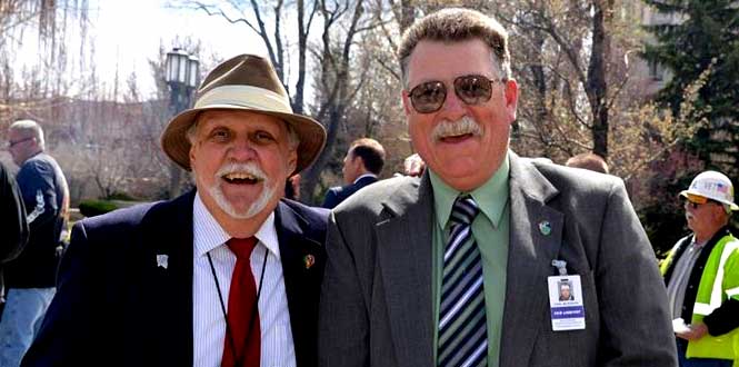Brothers in arms...and legs (Carson City, Nev., 3-27-2013) Andrew Barbano and Paul McKenzie at a union demonstration on the capitol lawn during the 2013 Nevada legislative session. Brother McKenzie acquiesced to Barbano's request to hunker down far below big Paul's height of 6'-12" or thereabouts, thereby distorting reality which is standard operational procedure whenever dealing with state government. (Photo: Annie Jantzen, High Desert Gypsy Photography)[McKenzie paragraph from above moved here in print edition.]