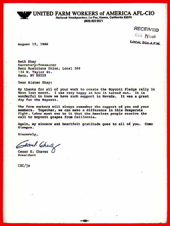 Aug. 1986 Letter from César Chávez to Beth Shay,