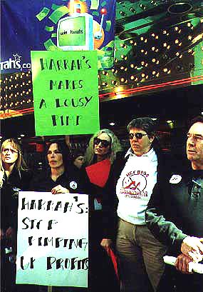 HITTING THE BRICKS & HARRAH'S, TOO (Reno, 2-16-2001) Left to right, cocktail servers Nancy Standley, Leslie Williams and Kricket Martinez, bartender Darlene Jespersen and security guard Tom Stoneburner demonstrate against debilitating high heels and other worker-brutalizing policies, such as those which cost Jespersen her job. She attended the June 15 cocktail server protest in front of the Venetian Hotel on the Las Vegas Strip and filed major civil rights litigation against Harrah's on July 6. |