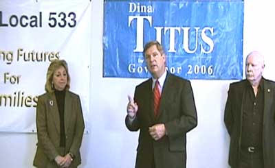 EARLY START (Oct. 20, 2006) Iowa Gov. Tom Vilsack, a former member of the Teamsters union, campaigns for gubernatorial nominee State Sen. Dina Titus, D-Las Vegas, left, at the Teamsters Local 533 hall in Reno. The Democratic leaders were welcomed by Local 533 Secretary-Treasurer Mark Tracy, right. In the November general election, Sen. Titus narrowly lost to GOP nominee Rep. Jim Gibbons, R-Nev. She will return to the state senate as minority leader in the 2007 legislative session.