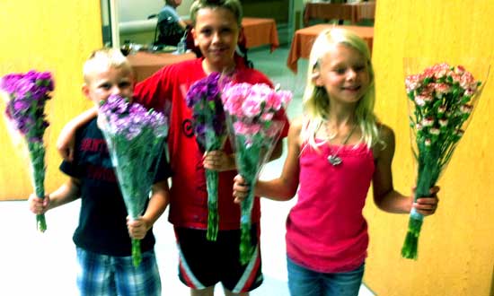 FLOWER CHILDREN (8-22-2013) Left to right Nicholas Koski (age 8), Jesse Brown (age 11), and Avery Koski (age 8), deliver 30 bouquets to the Hearthstone of Northern Nevada skilled medical and rehabilitation facility in Sparks. The floral flourishes were obtained by Teamsters Local 533 Office Administrator/Dispatcher Lynnelle Carter, mother of Avery and Nicholas.